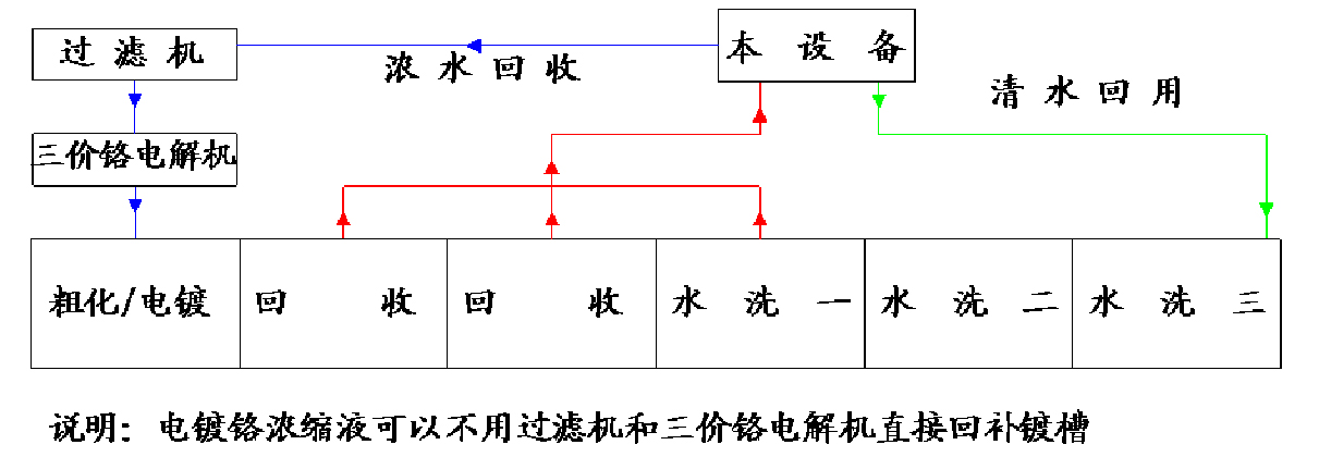 本設(shè)備只針對電鍍生產(chǎn)線的鍍鉻后回收水和塑料電鍍的粗化回收水,也可用于回收后續(xù)清洗水(清洗水采用本工藝運行成本偏高,經(jīng)濟利益效益不明顯)。